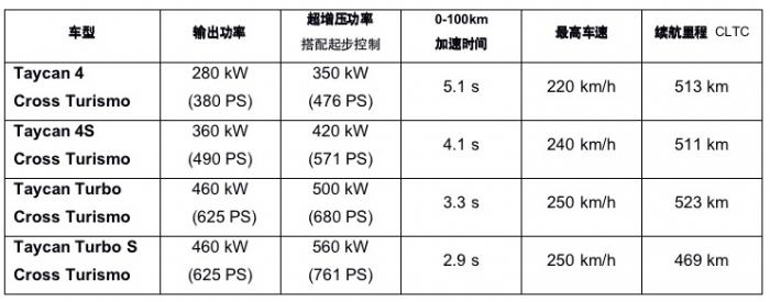 需要指出的是,Taycan Cross Turismo的四个版本,主要是动力性能有差异,它们均标配 93.4 kWh的蓄电池,在续航里程上也由于动力性能的差异有些许不同,例如,零百加速时间达到2.9 s、最高时速达到250km的版本,续航里程为469km。
