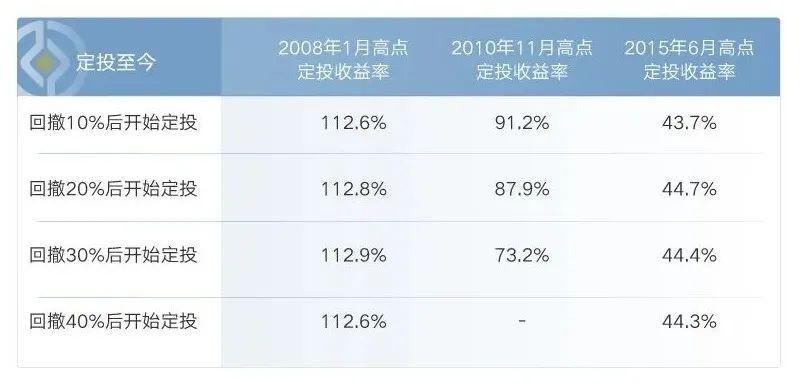 来看一组数据,假如我们以偏股混合型基金指数为标的,选取几个从市场最高点大幅回撤的时点,比如2008年、2010年和2015年,从下跌10%,20%,30%和40%之后都开启定投,坚持至今的话平均收益率为113%,84%和44%,是相当不错的收获了。