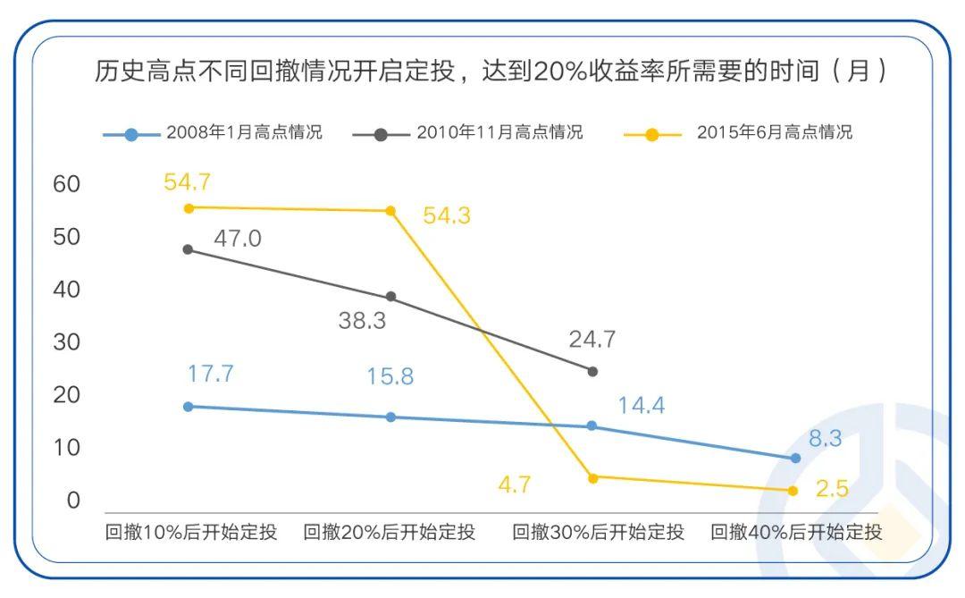 数据显示,随着市场回撤越大,达成定投收益目标的时间越短,比如,在2008年和2015年回撤40%之后,实现20%收益目标仅需要8.3个月和2.5个月。