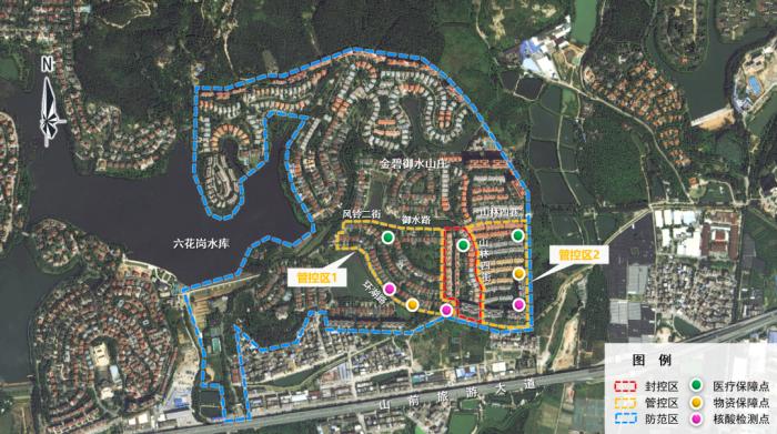 管控区:风铃二街、御水路、山林四巷以南,环湖路、环湖街以北,御水路以东,小区东侧围墙以西区域(封控区除外)。