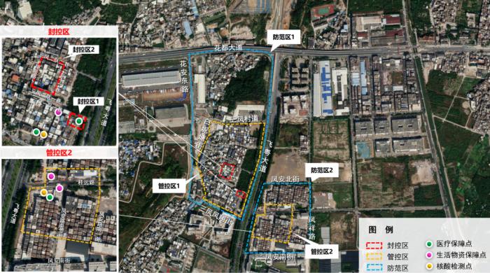 防范区:花都大道以南、三凤凤翔街以北、花安东路以东、飞粤大道以西区域(封控区、管控区除外);凤安北街以南、凤安南街以北、飞粤大道以东、凤祥路以西区域(封控区、管控区除外)。