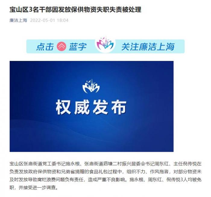 据“廉洁上海”消息,上海宝山区张庙街道党工委书记施永根、张庙街道泗塘二村振兴居委会书记周东红、主任倪传悦在负责发放政府保供物资和兄弟省捐赠的食品礼包过程中,组织不力、作风拖沓,对部分物资未及时发放导致腐烂浪费问题负有责任,造成严重不良影响。施永根、周东红、倪传悦3人均被免职,并接受进一步调查。