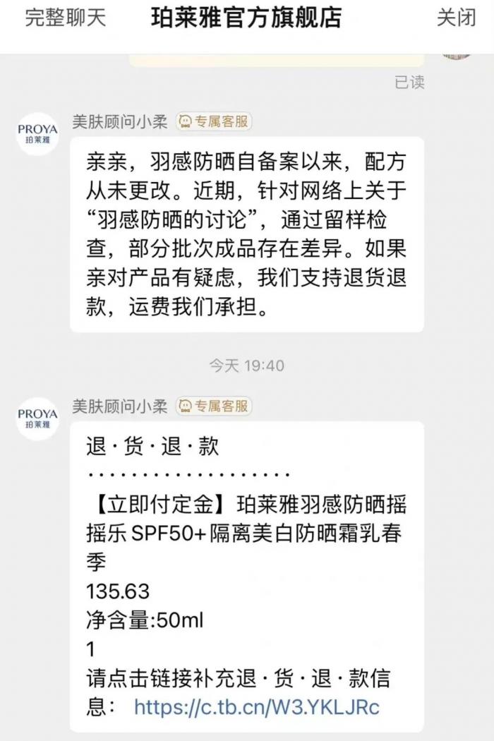 珀莱雅表示,近期,网络上有一些关于该公司产品“羽感防晒”(珀莱雅轻享阳光羽感养护精华防晒液)的讨论,针对这些讨论,公司相关工作人员于27日晚连夜赶往工厂所在地,截至28日下午2点,完成了对多个批次留样产品的相关检查。珀莱雅强调,“羽感防晒”自备案以来,配方从未更改,由于是油包水低粘度的防晒产品,生产工艺难度高。在检查中发现部分批次成品存在差异,影响了部分消费者的使用体验,在此深表歉意。