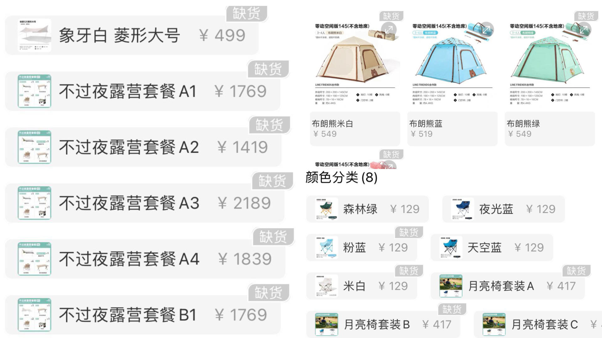 户外品牌牧高笛旗舰店中,帐篷、天幕、户外椅、户外垫等一系列露营装备都被打上灰色的“缺货”标签。
