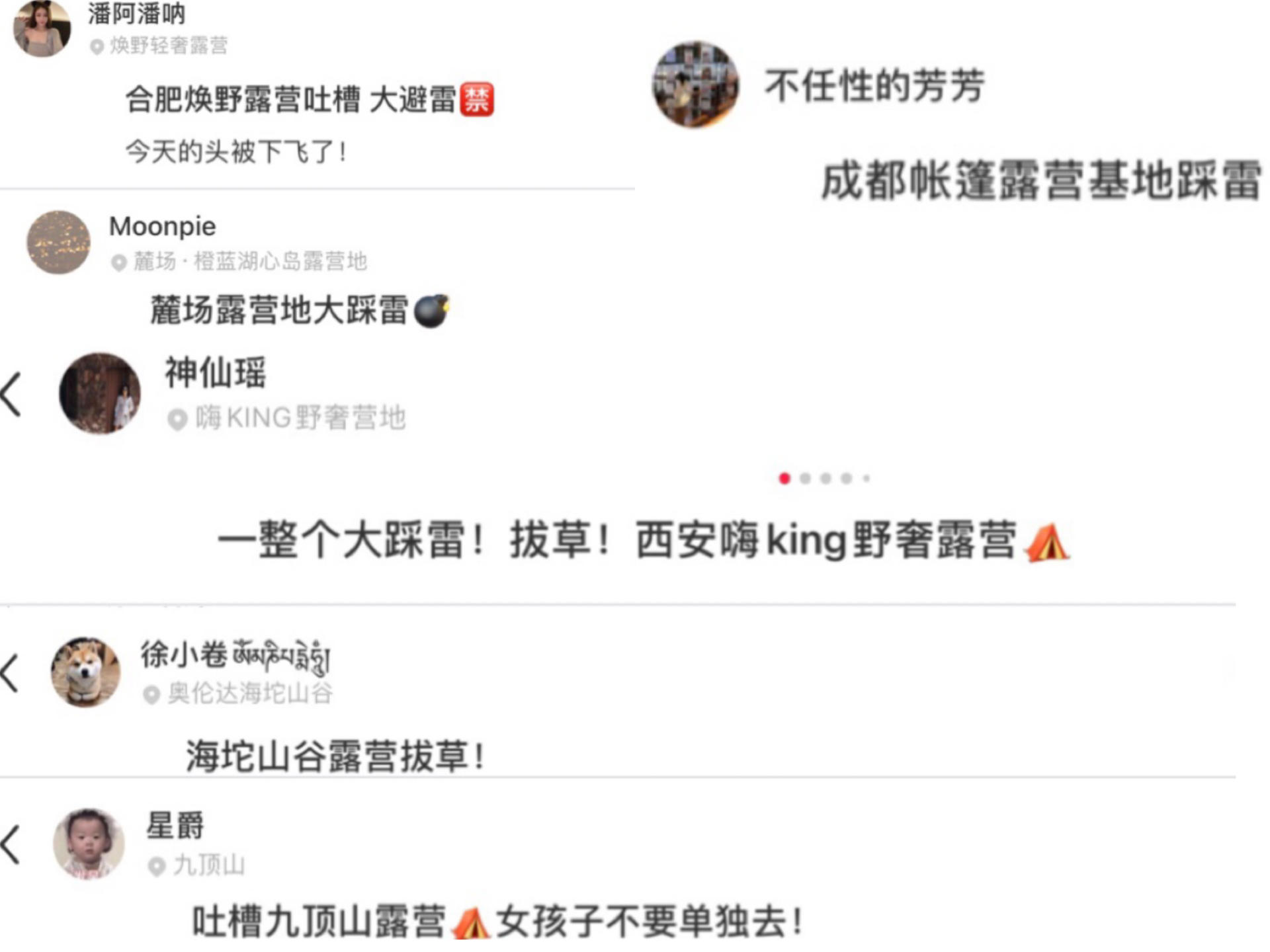 小红书上,露营的相关笔记中,总会出现“拔草”、“被坑”、“环境差”、“卫生差”、“踩雷”等吐槽。