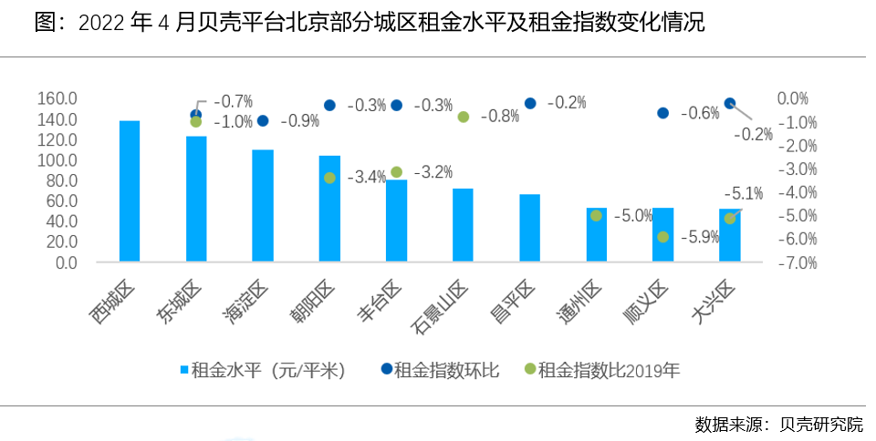 除西城、通州、石景山外,其余7个城区租金环比微跌。根据贝壳研究院数据,4月北京7个城区租金环比微跌,跌幅在2%以内。从同比来看,4月10个城区租金均同比微涨,除了昌平、海淀、西城外,其余7个城区租金相比于2019年同期均下跌。