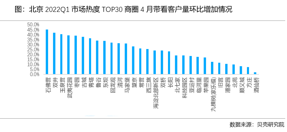 北京超7成商圈租赁市场环比降温,2022Q1市场热度TOP30商圈中除望京、长阳、临河里、东坝成交环比增加外,其余26个商圈均降温。根据贝壳研究院数据,4月北京超7成商圈租赁成交环比减少,租赁市场季节性回落。2022Q1市场热度TOP30商圈中,除望京、长阳、临河里、东坝等4个商圈租赁成交环比增加外,其余商圈均降温。从租金水平来看,4月2022Q1市场热度TOP30商圈中,20个商圈租金水平环比持平或微涨,除青塔外,其余商圈租金水平同比微涨。从需求端热度变动来看,石佛营、双井、玉泉营商圈为带看客户量增加最快的商圈。