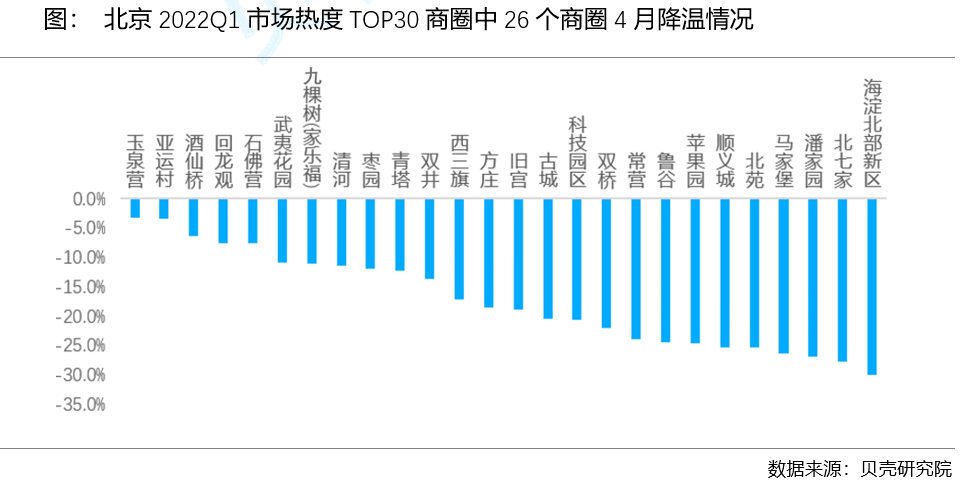 ■ 4月北京租赁市场热度季节性回落。根据贝壳研究院数据,4月北京租赁成交环比减少12.6%,10个城区均环比减少;从商圈来看,近7成商圈租赁成交环比减少。
