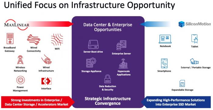 5月5日,美国通信领域芯片厂商迈凌科技MaxLinear(纳斯达克:MXL)与NAND Flash主控存储芯片厂商慧荣科技Sillicon Motion(纳斯达克:SIMO)共同宣布,双方达成协议,将由前者通过现金和股票交易的方式,以美国存托凭证(ADS)114.34 美元/股的价位收购慧荣科技,相比4月22日慧荣收盘价计算溢价48%,合并后公司价值将达到80亿美元。