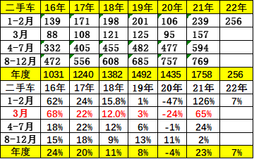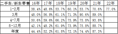 近几年国内二手车市场呈现蓬勃发展的良好态势,尤其是在国家鼓励二手车流转的政策推动之下,二手车的交易环境日益的改善,交易数量大幅的提升。从2016年的1000万台水平到2021年的1758万台水平,持续大幅增长,只有2020年出现小幅的下滑,但2021年又出现了超强增长态势,熨平了强势增长态势。2022年二手车仍处于蓬勃发展的良好的态势,表现是相对较强的。