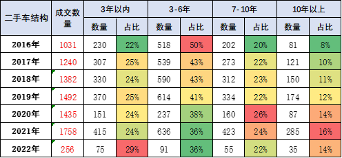 二手车市场的结构基本上来看是以三到六年的车为主,占据核心的主力,而三年以内的车也相对来说占到25%左右的比例,相对较强,两者合起来占到60%左右的比例。
