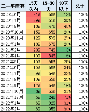 过去几年二手车的库存总体来看,处于15到30天的库存为主的特征。从去年年末缺芯以来30天以上的库存占到60%左右的比例,而15天以内的库存相对占比是比较小的。近期30天以上的库存是相对比较高的,这段时间因为行业缺芯,又由于去年底到今年30天以上的库存占比相对增加比较多,增加了整个二手车经销商的经营的压力,体现了整个二手车的流转速度在相对放缓的特征。