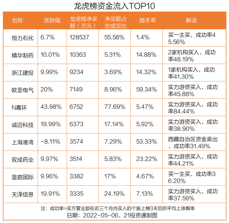 5月6日,上证指数下跌2.16%,深证成指下跌2.14%,创业板指下跌1.9%。盘后龙虎榜数据显示,共有59只个股因当日异动登上龙虎榜,资金净流入最多的是恒力石化(600346.SH),达12.85亿元。
