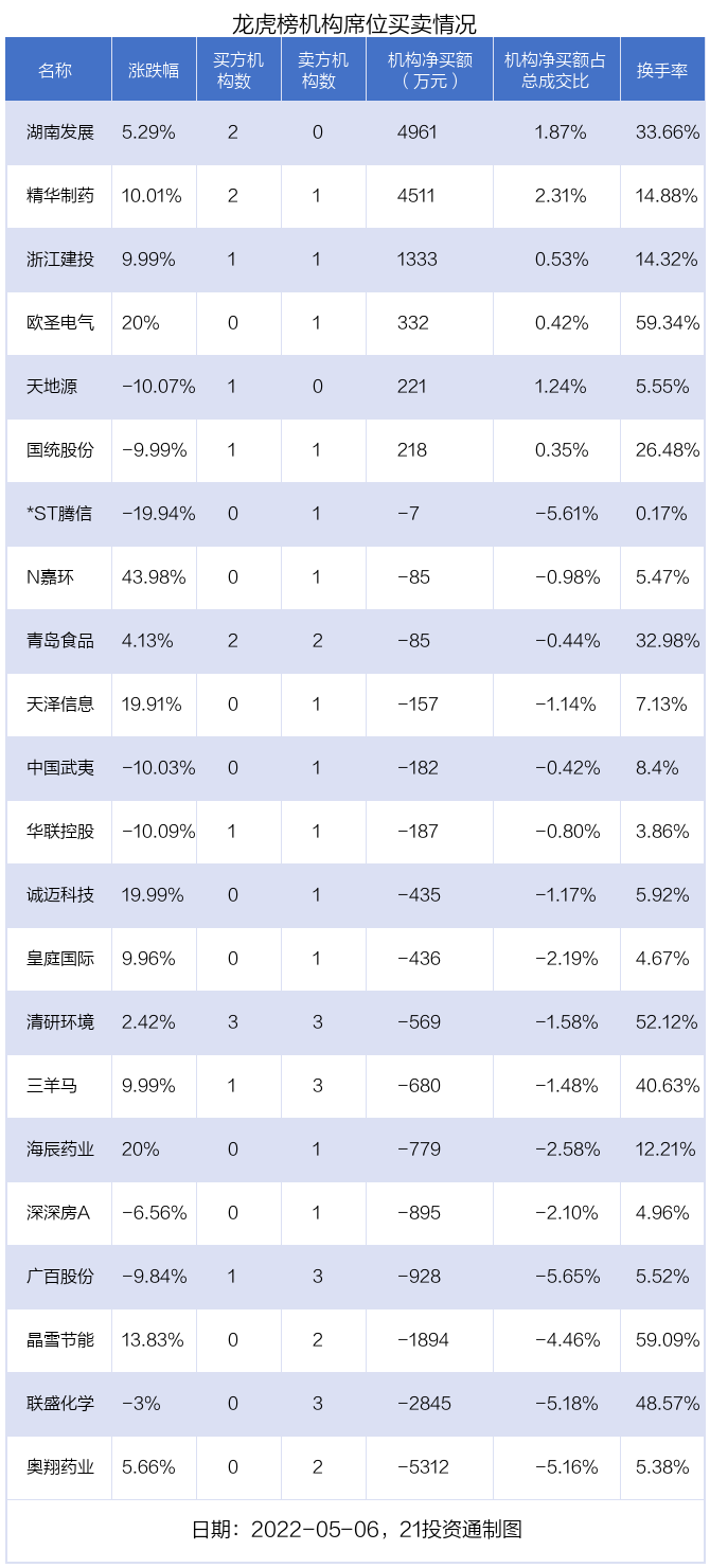 5月6日,22只个股龙虎榜出现了机构的身影,机构合计净卖出3901.03万元。具体来看,机构净买入6股,净卖出16股。