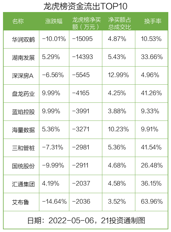 而龙虎榜中资金净流出最多的是华润双鹤(600062.SH),被净卖出为1.51亿元,占总成交金额的4.87%。华润双鹤收盘下跌10.01%,换手率为10.53%。