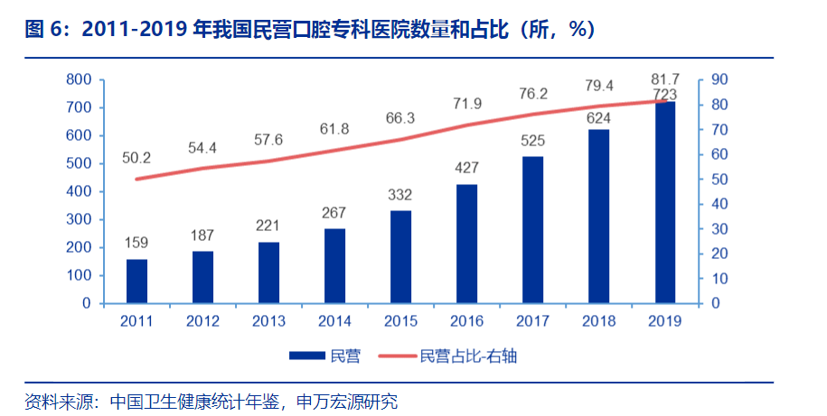 随着民营医院市场份额不断扩大,可以预见的是,未来口腔领域民营市场份额也将会得到持续提升。