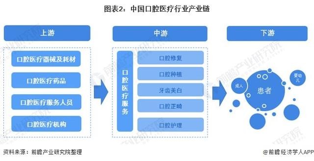 从产业链来看,口腔医疗产业链较短,大致可以分为三个部分:上游是口腔医疗器械及耗材和口腔医疗药品的生产商以及口腔医疗服务人员、医院等口腔医疗机构;中游为口腔医疗服务的各种项目;终端下游则是需要接受口腔医疗服务的患者。