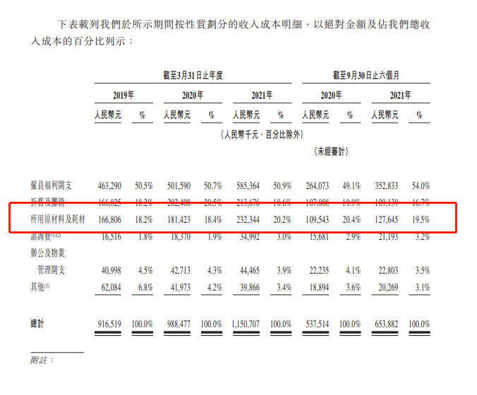 而根据中国经济网报道,2020年度通策医疗材料成本3.1亿元占营收15%,据瑞尔集团招股书数据披露,2021财年公司所用原材料及耗材成本2.32亿元,占总收入成本的百分比为20.2%。