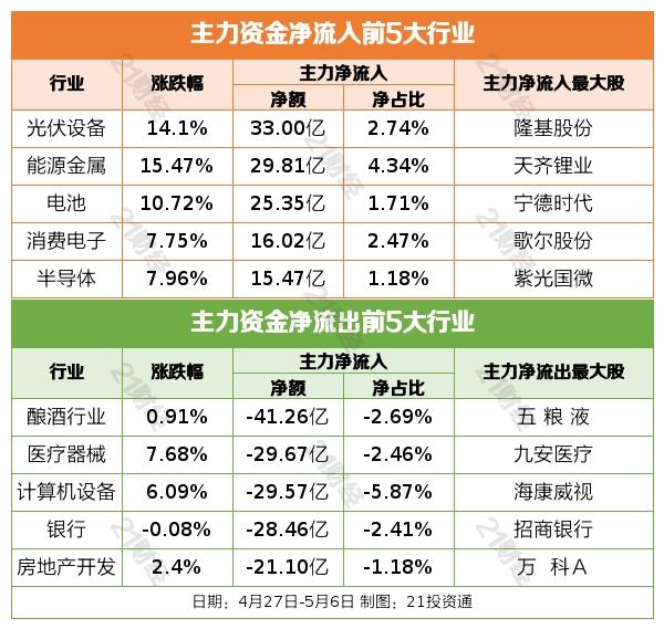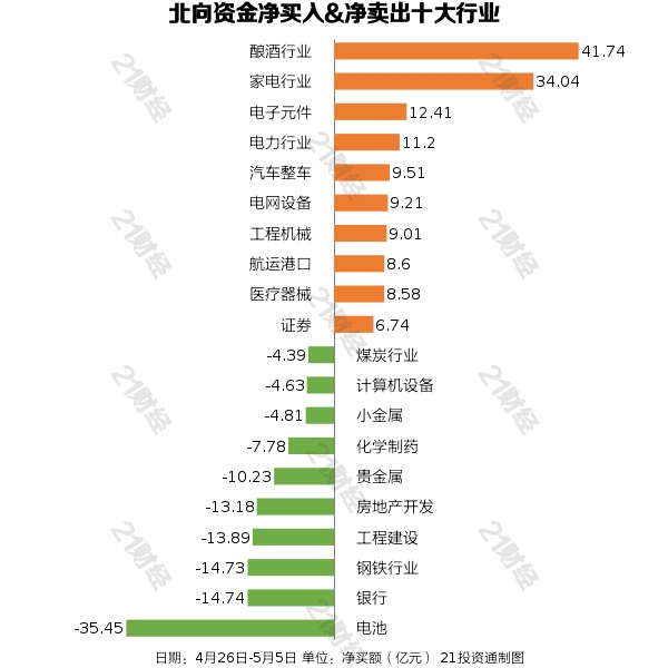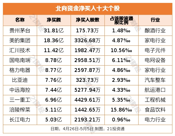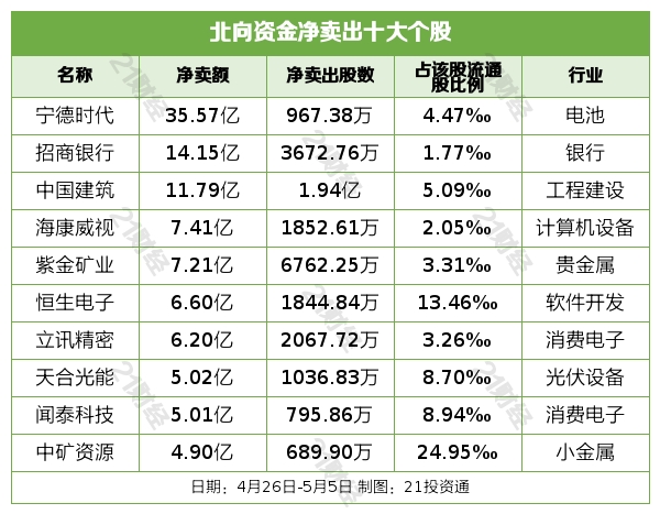 据21投资通(微信号ID:touzit21)智能监测,4月26日-5月5日,北向资金净卖出23.62亿元,其中沪股通净买入0.85亿元,深股通净卖出24.48亿元。5月6日,北向资金暂停交易。