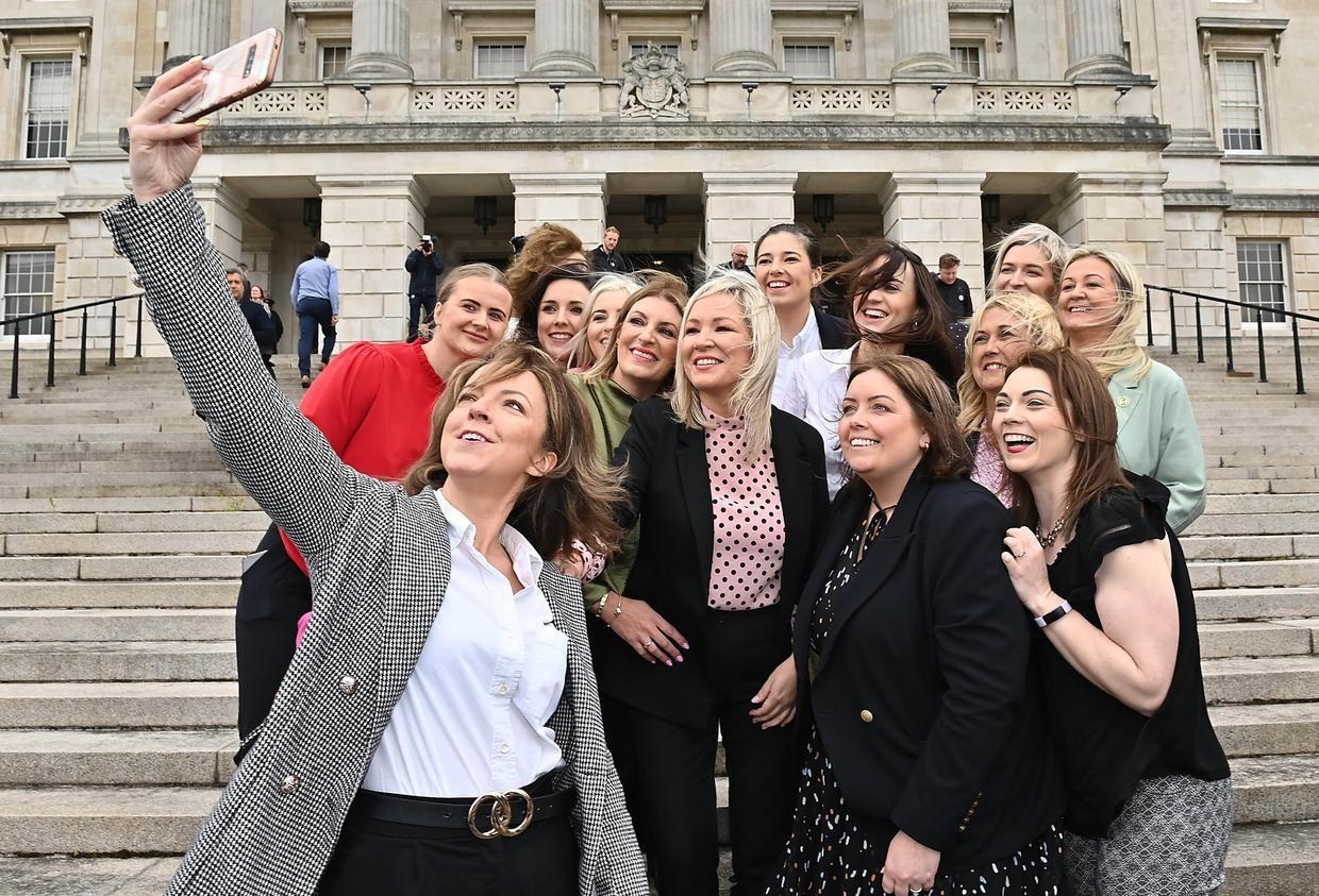 △奥尼尔(前排中)与党内拥护者在北爱尔兰议会前拍照(图自《贝尔法斯特电讯报》)