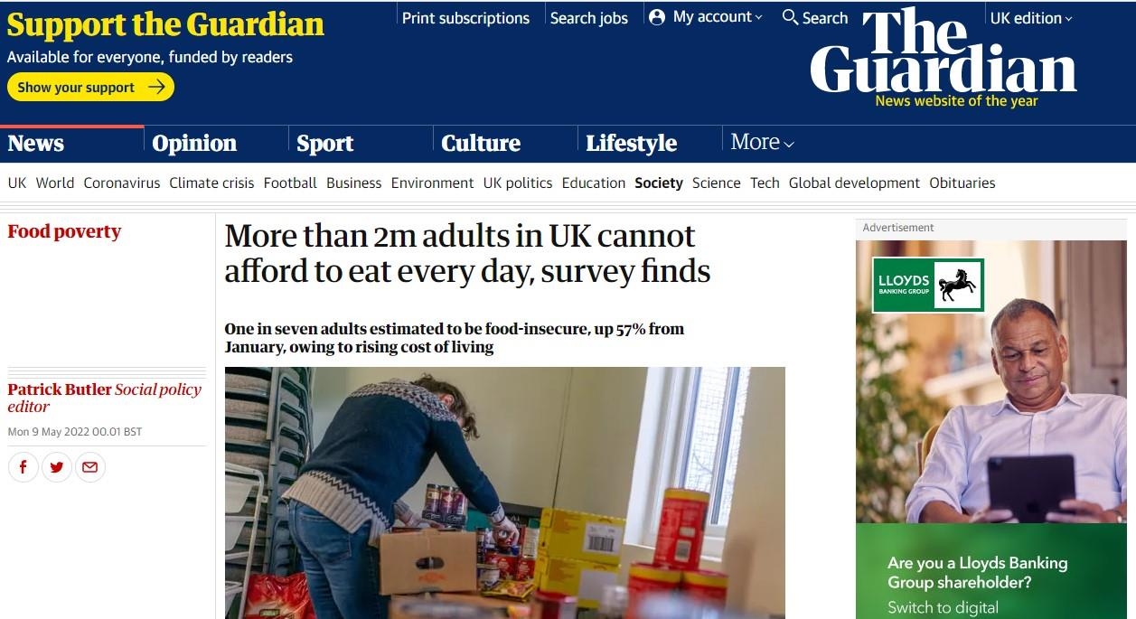 一项最新调查显示,在过去的一个月里,英国有超过200万成年人因为吃不起东西而一整天饿肚子。而在今年前三个月,为了减少食物开销,甚至省去一餐饭的家庭比例猛增57%。目前在英国,每七个成年人中就有一个得不到一日三餐保障,人数高达730万。这样的情况令不少民众对英国政府产生了质疑。