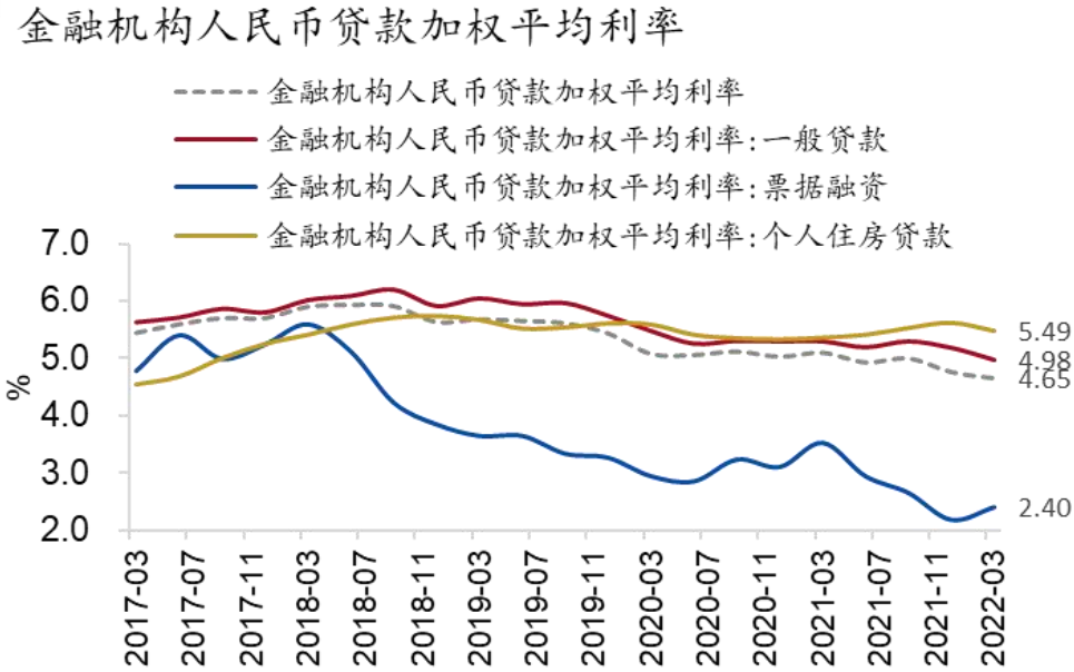 “降成本”方面,在央行的政策支持和引导下,企业贷款加权平均利率稳步下行,今年一季度较2021年下降21bp至4.4%,创下有统计以来最的低点。今年以来,央行引导1年期和5年期LPR分别下降10bp和5bp,推动相关贷款利率稳中有降。3月人民币一般贷款加权平均利率同比下降32bp至4.98%,其中企业贷款加权利率同比下降27bp至4.36%,个人住房贷款利率同比小幅上升12bp至5.49%。合理充裕的流动性推动市场利率下行,同期票据利率大幅下降112bp至2.40%。