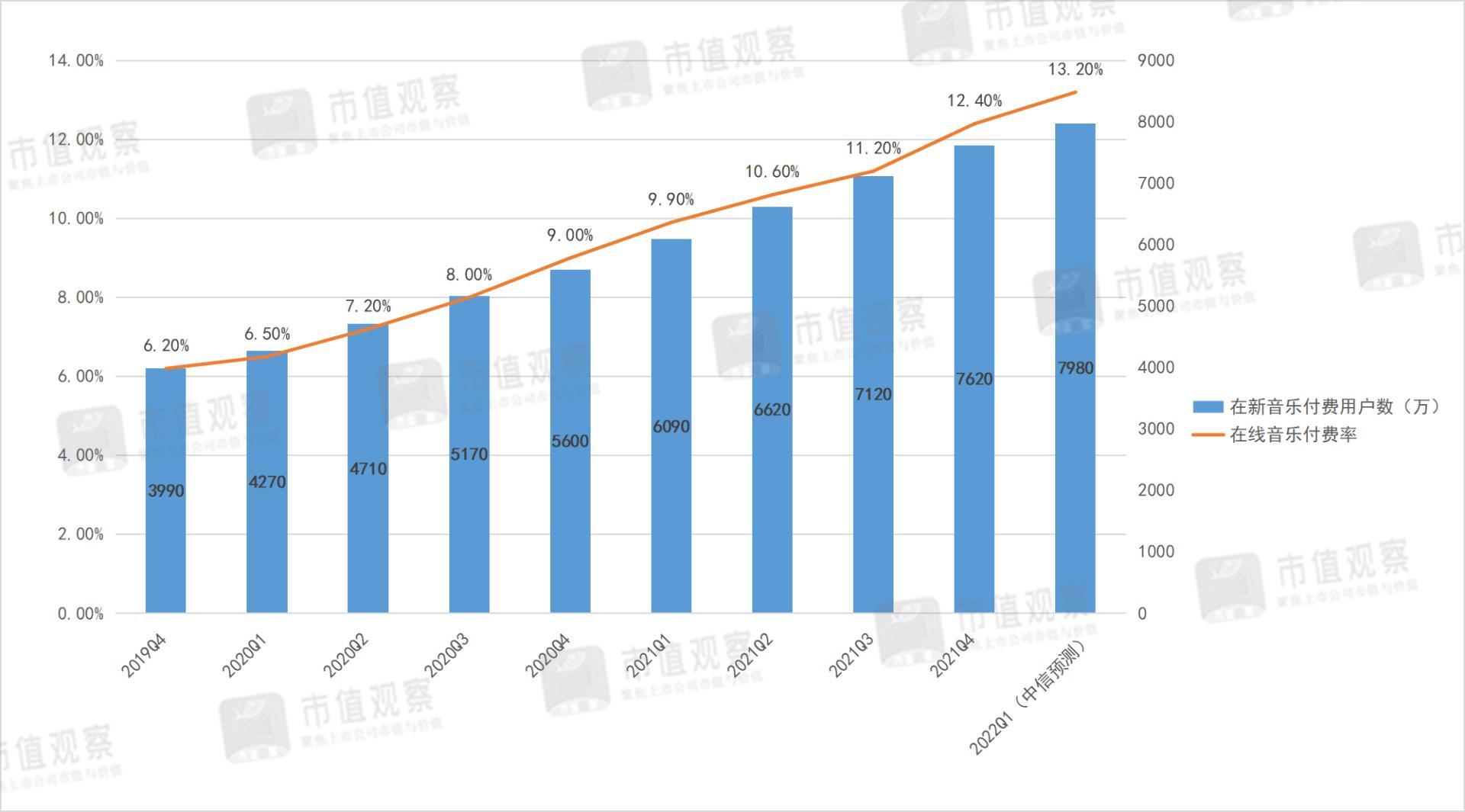 根据中信证券、华泰证券等头部机构的一致预期,今年一季度,腾讯音乐的在线音乐付费用户和付费率仍将继续攀升。其中,中信证券给出的预测是付费用户增长到7980万,付费率达到13.2%。