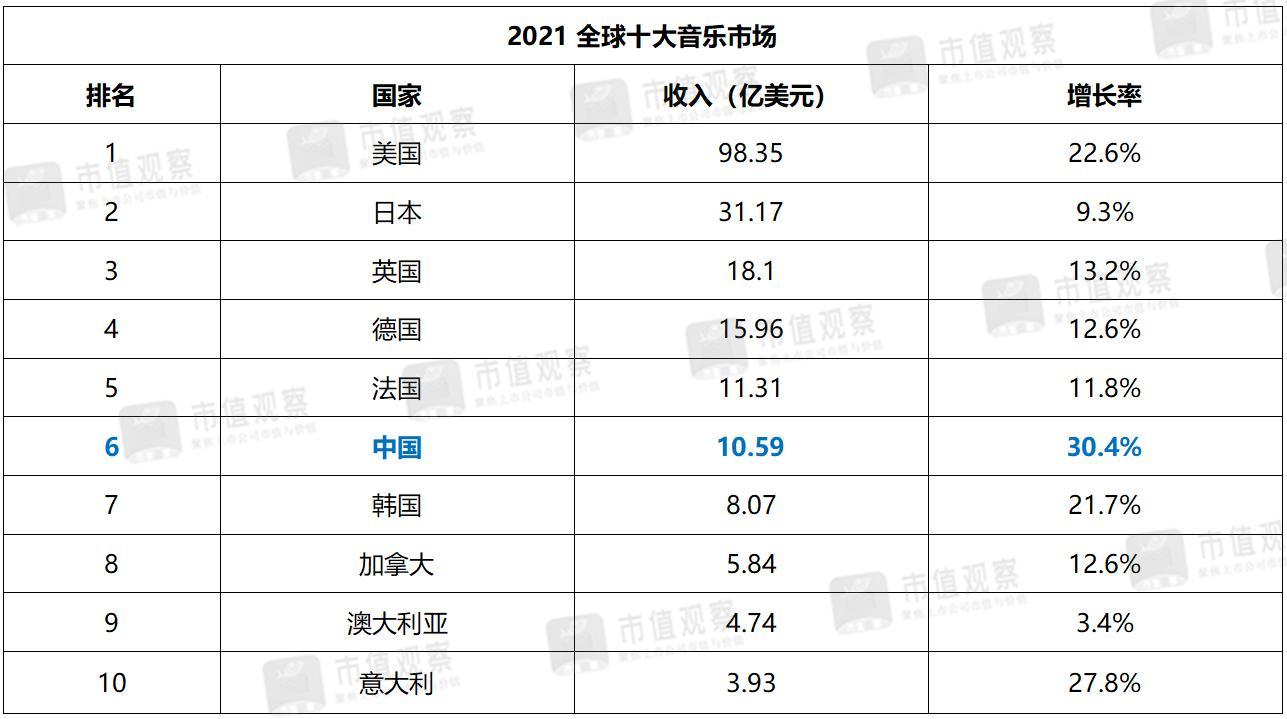 作为中国数字音乐的代表,腾讯音乐的发展也是中国音乐行业发展的缩影。根据IFPI发布的《全球音乐报告2022》,中国已成为发展最快的市场之一,2021年再次超越韩国,全球排名从2015年的14位上升到2021年的第6位。有两个数据尤其值得关注,一个是中国已经是全球前十大市场中增长最快的市场;另一个是排名第一的美国,也仍然保持了20%以上的高增速,这证明中国乃至全球音乐产业的发展仍将持续增长。