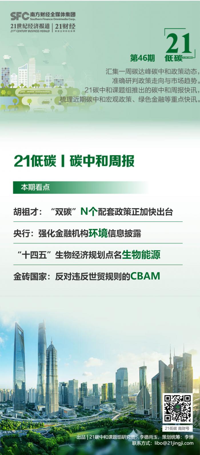 本期看点:发改委副主任胡祖才:“双碳”N个配套政策文件正加快出台;央行:强化金融机构环境信息披露 开展碳核算发展碳金融;《“十四五”生物经济发展规划》发布,点名“生物能源”;金砖国家应对气候变化高级别会议:反对违反世贸规则的碳边境调节机制。