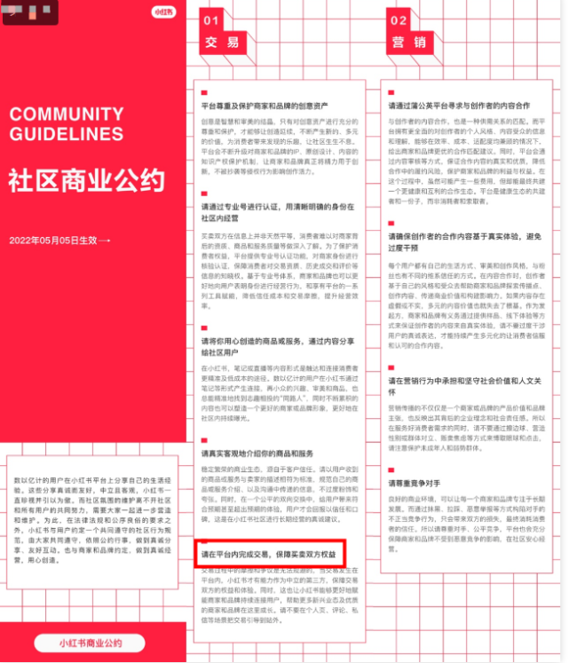 其中,《社区商业公约》表示:请在平台内完成交易,保障买卖双方权益。有知情人士对外透露,如果不遵守规定在站内完成交易,将受到惩罚。