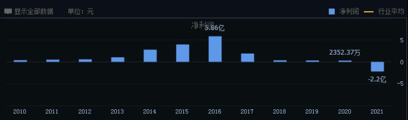 公司在2016年归母净利润达到5.86亿峰值。从2017年开始业绩大幅下滑,并于2021年亏损2.2亿元,创下近十年业绩新低。