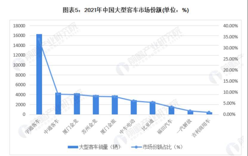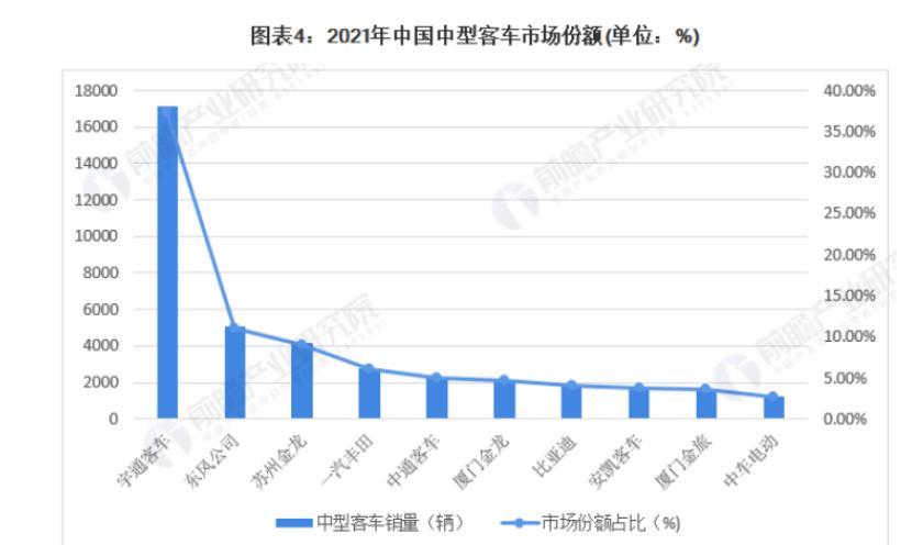 在中型客车市场,宇通客车2021年销量达到了17392辆,市场份额占比逾37%,而中通客车销量为2641辆,市场份额占比低于6%。