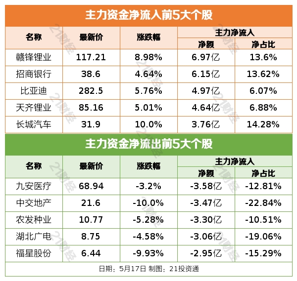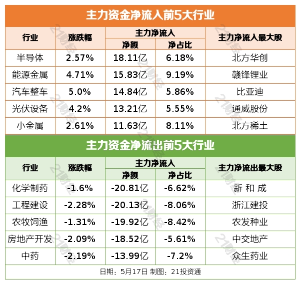 据21投资通(微信号ID:touzit21)智能监测,5月17日,北向资金净买入59.6亿元,其中沪股通净买入32.83亿元,深股通净买入26.77亿元。增持银行,减持煤炭行业。