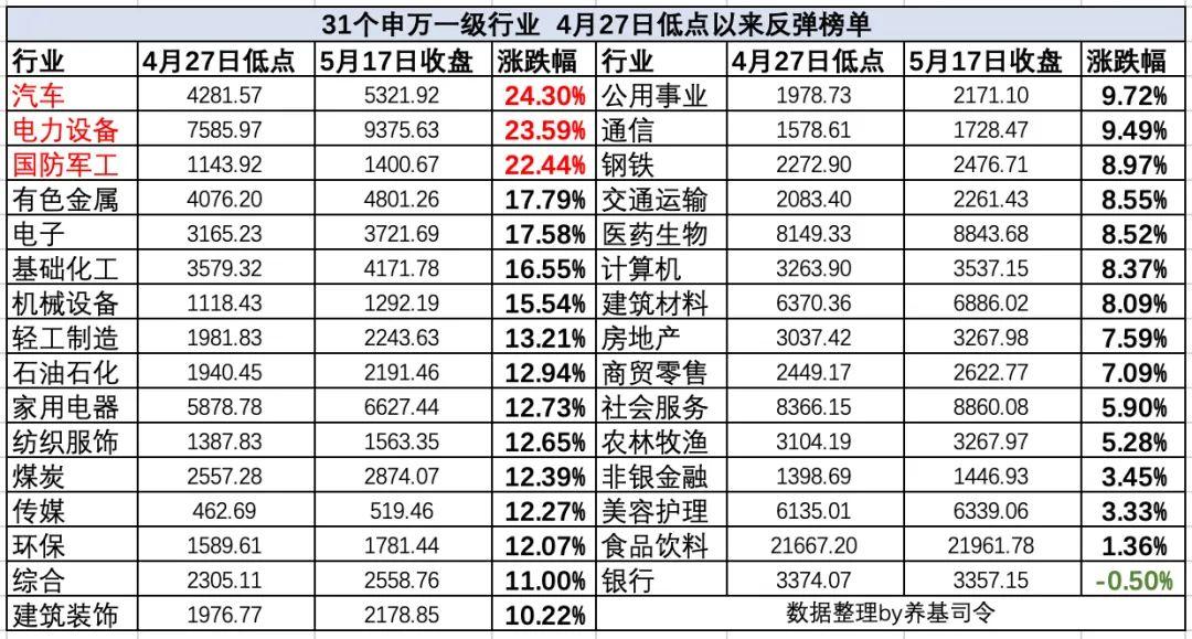 司令以31个申万一级行业为例,截至5月17日收盘,4月27日以来汽车大涨24.30%,电力设备大涨23.59%,国防军工大涨22.44%,区间涨幅榜排名前三。有色金属、电子(半导体)、基础化工、机械设备行业表现同样出色,区间涨幅均超过15%;但是,银行、食品饮料、美容护理、非银金融、农林牧渔等行业表现较为落后,银行板块甚至还出现了下跌。