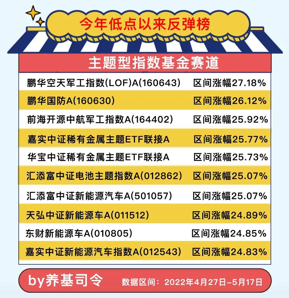 区间涨幅排名靠前的依次是:鹏华空天军工指数A、鹏华国防A、前海开源中航军工指数A、嘉实中证稀有金属主题ETF联接A、华宝中证稀有金属主题ETF联接A、汇添富中证电池主题指数A、汇添富中证新能源汽车A、天弘中证新能源车A、东财新能源车A、嘉实中证新能源汽车指数A,以上10只基金此轮反弹均超过24%。