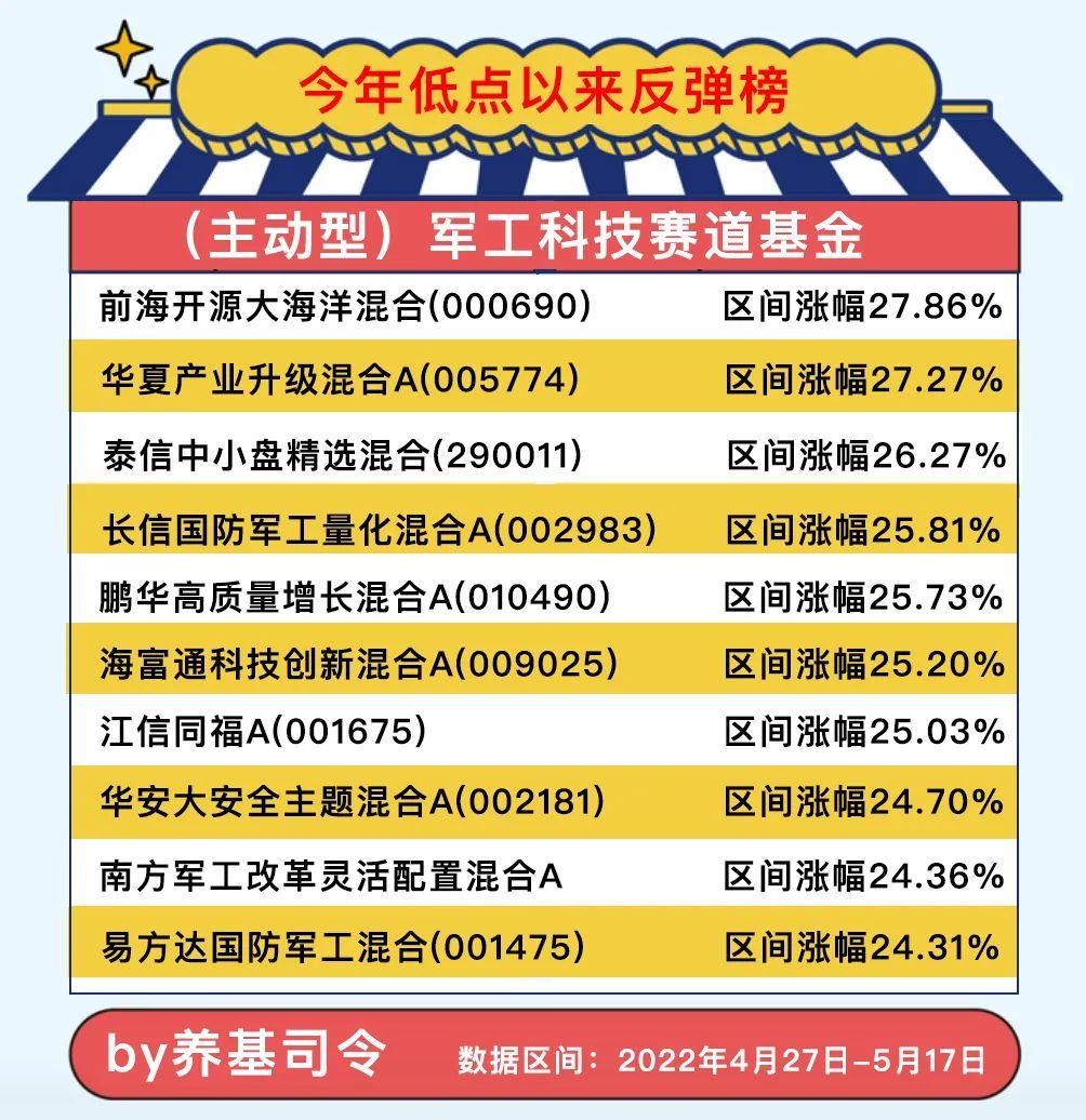 区间涨幅排名靠前的依次是:前海开源大海洋混合、华夏产业升级混合、泰信中小盘精选混合、长信国防军工量化混合、鹏华高质量增长混合A、海富通科技创新混合A、江信同福A、华安大安全主题混合A、南方军工改革灵活配置混合A、易方达国防军工混合,以上10只军工科技主题基金此轮反弹均超过24%。