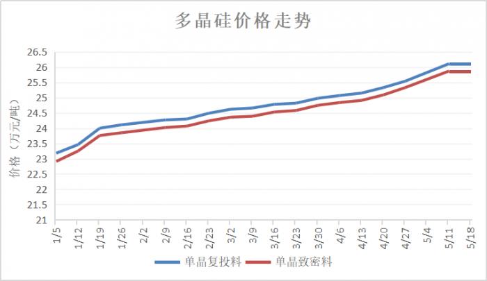 5月18日,中国有色金属工业协会硅业分会(下称“硅业分会”)公布的价格显示,本周,国内单晶复投料成交价在25.50至26.60万元/吨,成交均价26.11万元/吨;单晶致密料成交价在25.3到26.4万元/吨,成交均价25.87万元/吨。