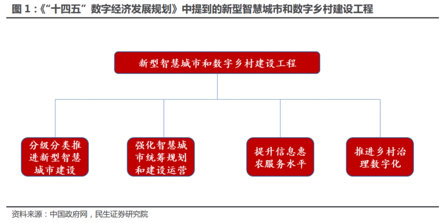 《“十四五”数字经济发展规划》中也以提升公共服务为目标,明确提及了“互联网+政务”、智慧城市与城乡数字化等方向。