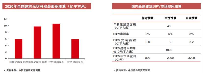 根据中信证券预测,未来每年新增建筑面积将达到40亿平方米以上,按照保守估计,光伏建筑一体化产品渗透率为2%,粗略估算其一年市场规模接近1000亿元;如果再考虑到存量建筑的改造需求,光伏建筑一体化总市场长期空间将达到万亿级别。