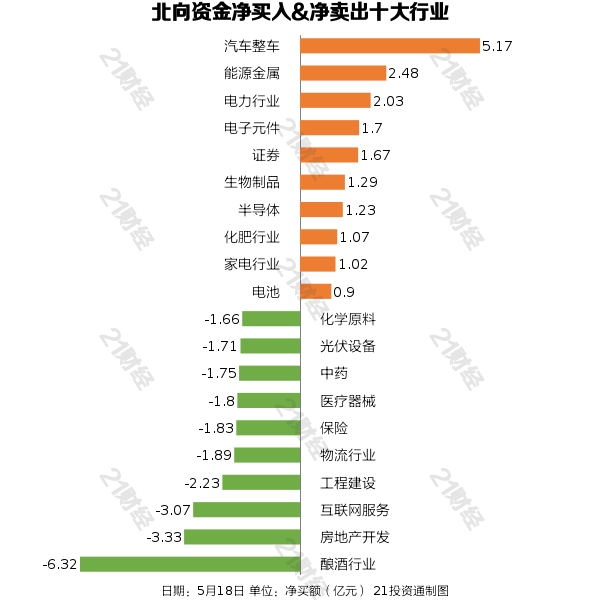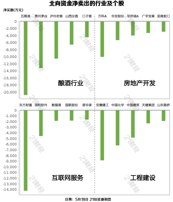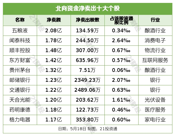 据21投资通(微信号ID:touzit21)智能监测,5月18日,北向资金净卖出22.77亿元,其中沪股通净卖出21.1亿元,深股通净卖出1.68亿元。