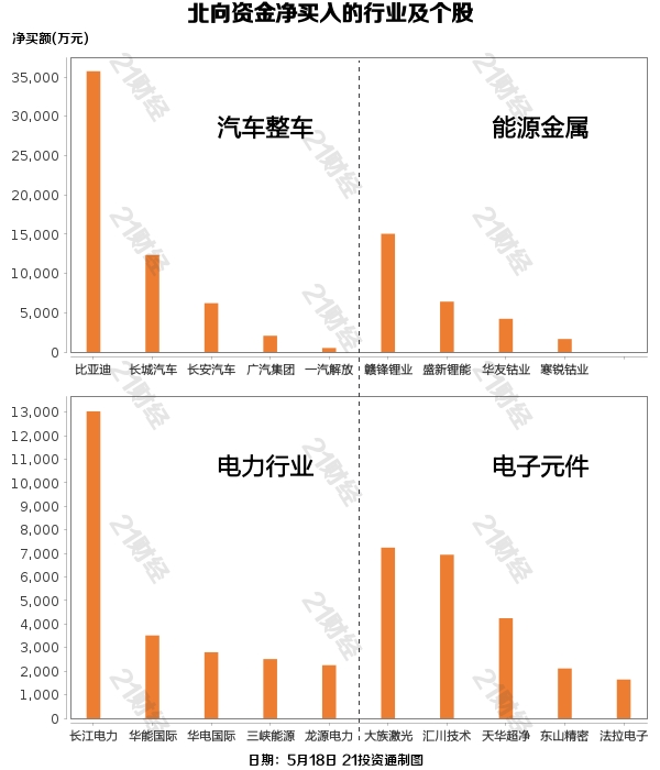 从净买入金额来看,北向资金增持了38个行业,其中汽车整车居首,净买入金额达5.17亿元,其次是能源金属行业,净买入2.48亿元。