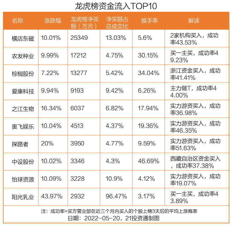 5月20日,上证指数上涨1.6%,深证成指上涨1.82%,创业板指上涨1.69%。盘后龙虎榜数据显示,共有53只个股因当日异动登上龙虎榜,资金净流入最多的是横店东磁(002056.SZ),达2.53亿元。
