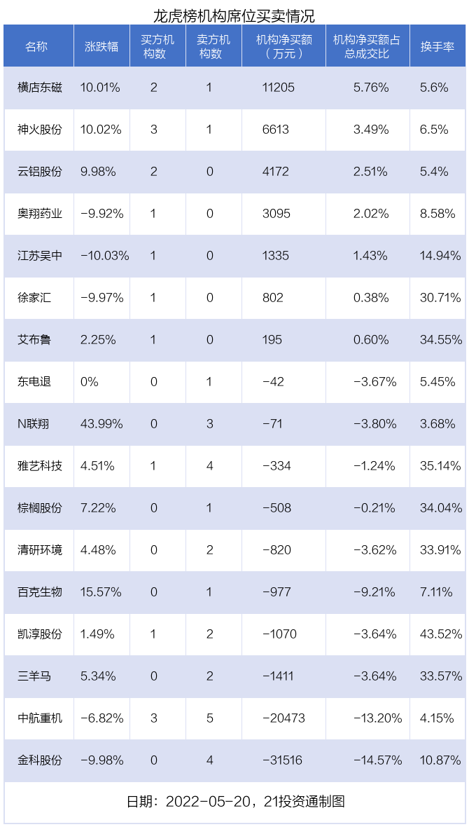 其中,机构净买入金额最多的是横店东磁(002056.SZ),当日收盘上涨10.01%,换手率为5.6%。前五大买卖营业部中有3家机构,为合计净买入1.12亿元,占总成交金额的5.76%。