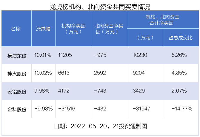 值得注意的是,机构和北向资金共同净买入了神火股份;共同净卖出了金科股份;在云铝股份,横店东磁上出现分歧,机构净买入云铝股份4172.22万元,北向资金净卖出743.35万元;机构净买入横店东磁1.12亿元,北向资金净卖出974.88万元。