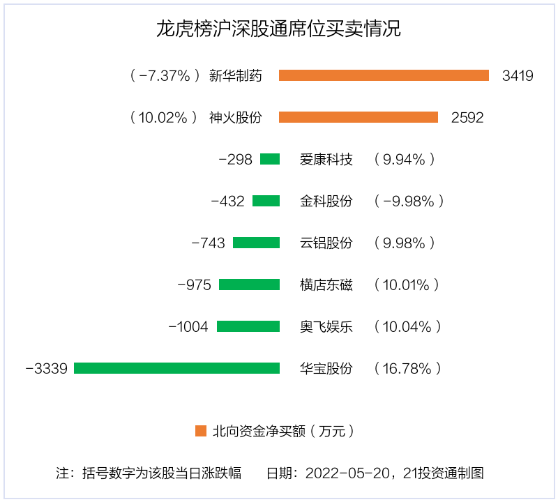 北向资金净买入金额最多的是新华制药(000756.SZ),净买入3418.56万元,占总成交金额的0.95%。净卖出金额最多的是华宝股份(300741.SZ),为3338.99万元,占总成交金额的7.63%,当日收盘上涨16.78%,换手率为2.74%。