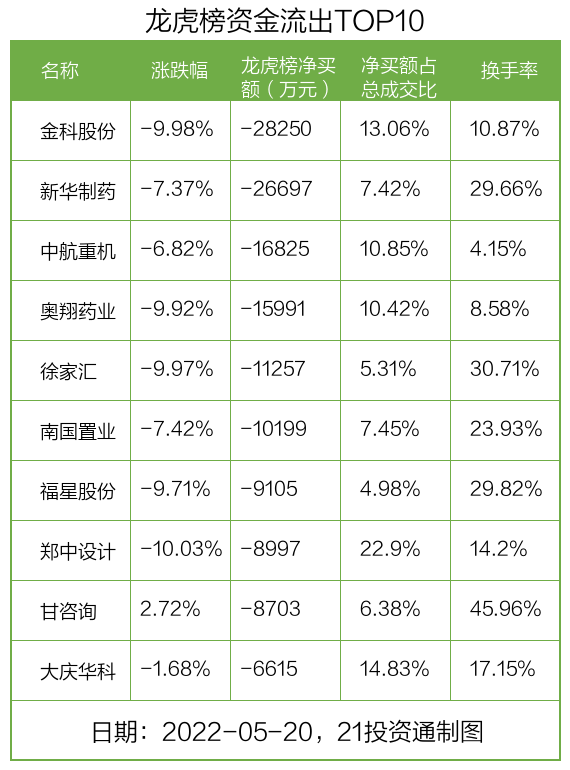 而龙虎榜中资金净流出最多的是金科股份(000656.SZ),被净卖出为2.82亿元,占总成交金额的13.06%。金科股份收盘下跌9.98%,换手率为10.87%。