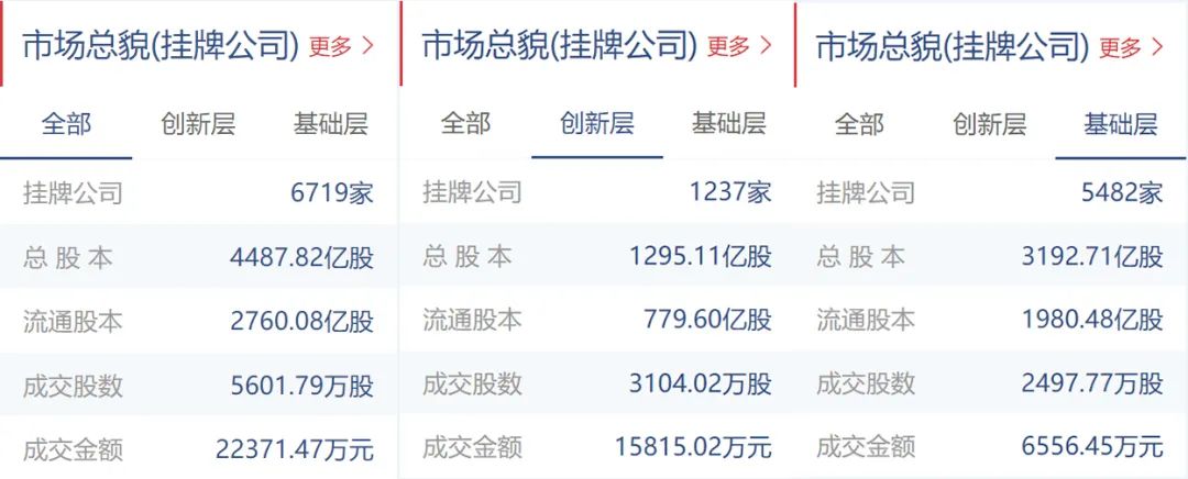 新三板挂牌公司总计6719家(创新层1237家,基础层5482家),总股本4487.82亿股,流通股本2760.08亿股。
