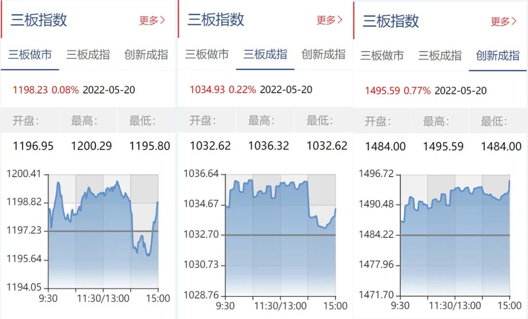 截至5月20日收盘,三板做市报1198.23点,上涨0.08%;三板成指报1034.93点,上涨0.22%;三板创新1495.59点,上涨0.77%。