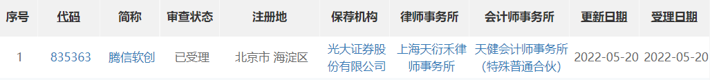 5月20日,北交所官网显示,腾信软创(835363)上市申请获受理。