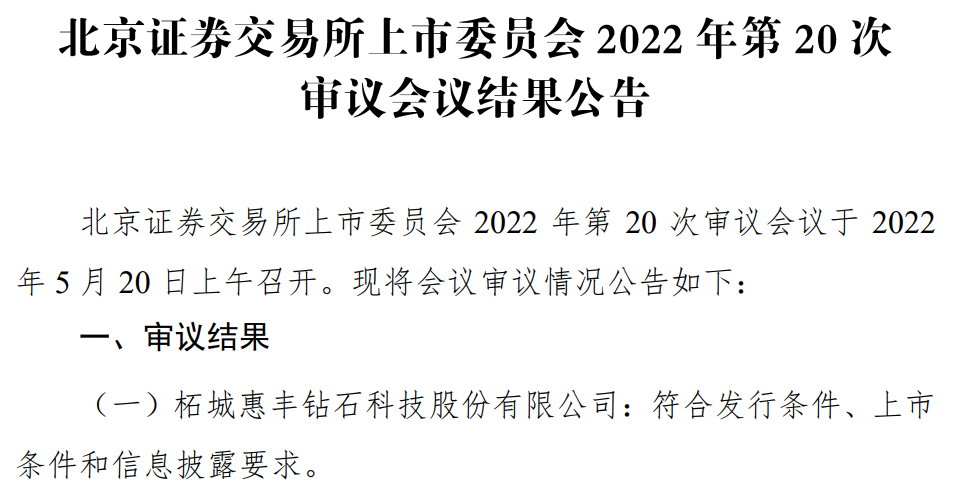5月20日,北交所发布2022年第20次审议会议结果公告,惠丰钻石(839725)过会。